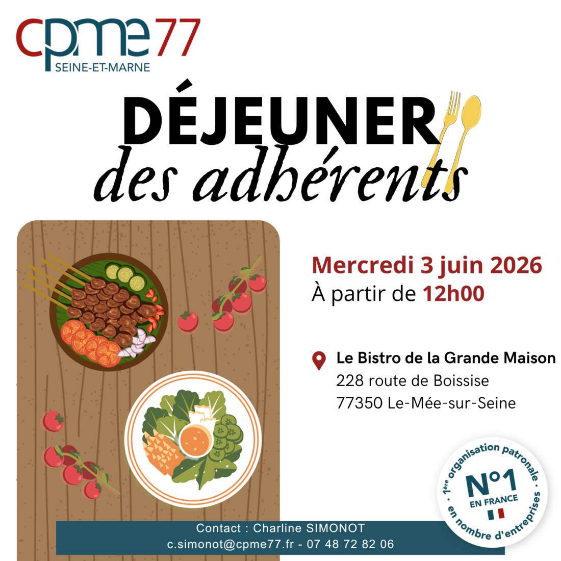 L’occasion d’apprendre et d’échanger sur différents thèmes liés à votre activité, avec de nombreux dirigeants, tous adhérents à la CPME77, de façon conviviale lors d’un déjeuner.