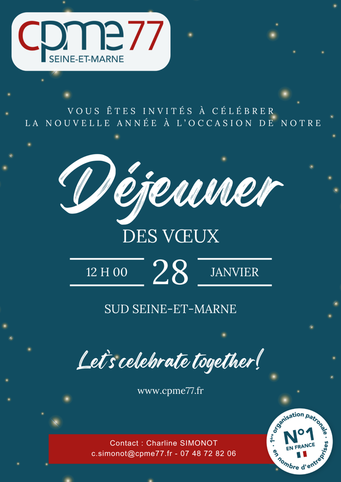 Ce moment convivial sera l’occasion de démarrer la nouvelle année ensemble, d’échanger vos vœux et de partager un temps privilégié entre dirigeants, tous adhérents à la CPME77, dans une ambiance chaleureuse et propice aux échanges.