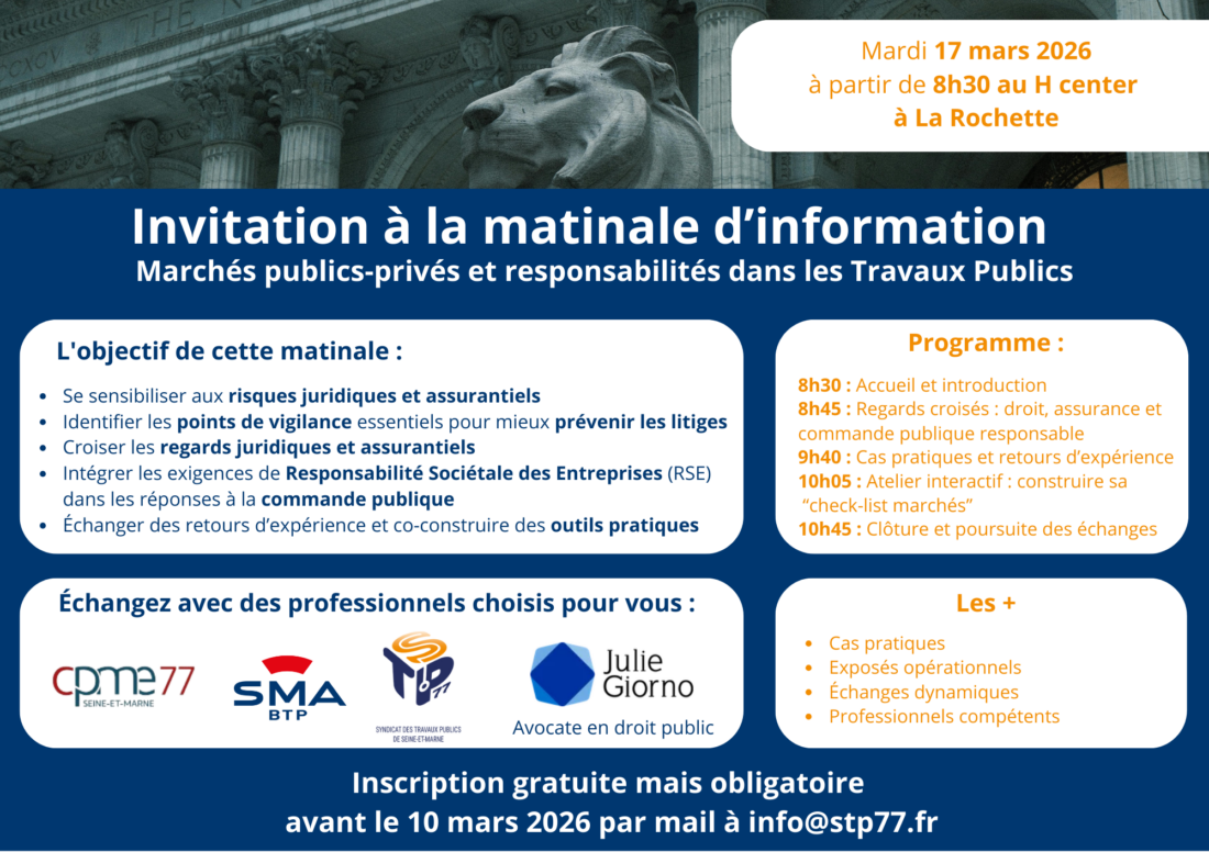 La CPME Seine-et-Marne (CPME77), en partenariat avec le Syndicat des Travaux Publics de Seine-et-Marne (STP77), organise une matinale d’information dédiée aux marchés publics et privés, aux responsabilités juridiques et aux enjeux assurantiels dans les Travaux Publics.
